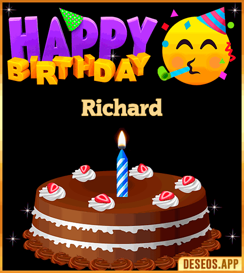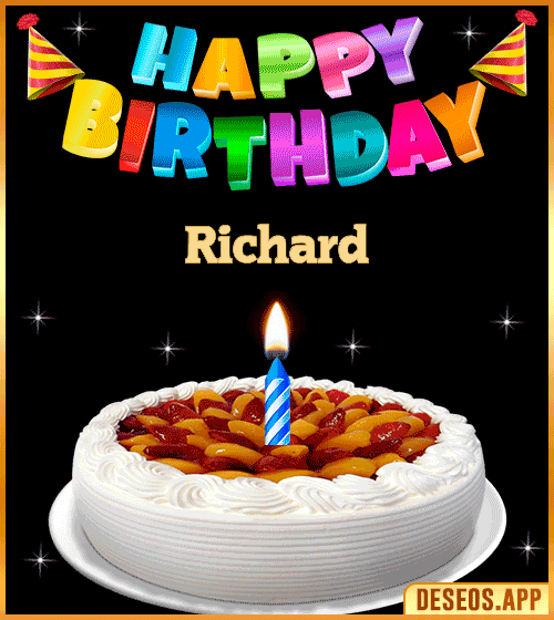 Make your loved one happy on their special day by sharing this amazing Richard Cake Happy Birthday Gif. Let your loved one admire this beautiful animated birthday cake with burning candles and wish them a Happy Birthday in the most creative way! Make their day even more memorable with this amazing GIF. Its eye-catching content and creative design make it perfect for expressing your birthday wishes.