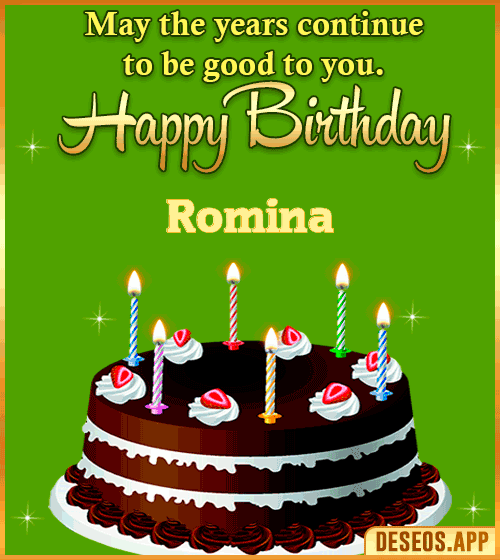 Surprise your loved one with these extraordinary images. Unique, original and artistic designs make this image beautiful and of good quality. Send them these cakes with "Happy Birthday Romina" written on them and let them feel your love on their special day! An animated image with cakes and lit candles, fireworks, balloons or personalized messages is the best way to wish your loved one 'Happy Birthday Romina'.