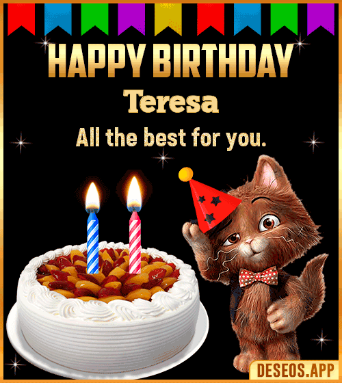 Make your loved one happy on their special day by sharing this amazing Teresa Cake Happy Birthday Gif. Let your loved one admire this beautiful animated birthday cake with burning candles and wish them a Happy Birthday in the most creative way! Make their day even more memorable with this amazing GIF. Its eye-catching content and creative design make it perfect for expressing your birthday wishes.